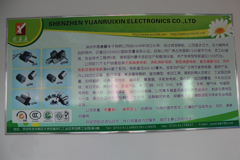 深圳市圓睿鑫電子有限公司自2008年創立以來,經過誠信耕耘,在為期兩年的時間內,已通過ISO9001:2000國際質量體系認證。公司廠房占地面積2000多平方米,員工100人,專業技術工程師6名,擁有國內最先進的生產和檢測設備,年產各類減速電機超過2~300萬臺。因公司發展需要,于2020年底,將生產基地遷往擁有最美小鎮之稱的東莞市清溪鎮,依山傍水,依托美麗的大自然環境和地方文化,全新的東莞市圓睿鑫電子有限公司將借助深圳母公司平臺,一步步走上新的臺階。 東莞公司將繼續致力于生產銷售各類無刷減速電機 渦輪渦桿電機,微型減速電機,直流減速馬達,交流手搖發電機、同步電機及空心杯電機等,電機直徑從6-60毫米為定位,系列產品廣泛用于智能家電、智能辦公自動化設備、智能醫療、美容健身器材、遙控模型、電動工具、高檔玩具以及其它工業驅動裝置,如高檔玩具、游戲機、麻將機、飄香器、手機發電機、柔巾機、自動噴霧器、汽車自動設施、電動牙刷、舞臺燈飾、圣誕產品、智能電子門鎖、VCD、DVD、水泵、氣泵、水表、煤氣閥、電磁閥、攪拌機、榨汁...